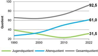 Im Betrachtungszeitraum hat sich der Altenquotient mehr als verdoppelt. Seit 2000 stieg der Altenquotient kontinuierlich auf einen Wert von 61 im Jahr 2022. Der Jugendquotient sank hingegen zunächst weiter ab, stieg aber bis 2022 wieder auf 31,5.