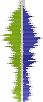 weiblich: linke Seite/ grün, männlich: rechte Seite/ blau, die Zahlen in Klammern bzw. die hell eingefärbten Säulenteile stellen die Anzahl der Ausländer in den Jahrgängen dar (Gesamtsumme: 90)