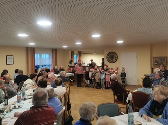 Einen Monat später, am 04.12.2024 konnten wir 57 Gäste aus Börln, Bortewitz, Schwarzer Kater und Radegast zur Rentnerweihnachtsfeier begrüßen. Bei Kaffee, Stolle, Lebkuchen und Fettbemme waren gute Gespräche garantiert. Besondere Aufmerksamkeit war dabei nötig, denn alle Gäste erhielten einen Weihnachts-Bingo-Zettel. Wer als erstes vier Begriffe in einer Reihe abstreichen konnte, durfte sich lautstark melden. Dieser Zwischenruf geschah während des Auftrittes der Kita „Börlner Spatzen“, dem Gewinner winkte eine Stolle. Mit Hilfe einer Preisfrage konnte anschließend ein zweiter Platz gekrönt werden. Die Kinder ließen sich von dem Zwischenruf nicht irritieren und boten weiterhin ihren Gesang, die Gedichte und Tänze dar.