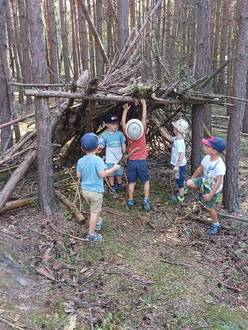 Unsere Spaziergänge führten uns während der Sommerferien oft in den Wald zu unserem Spielplatz „Rastplatz der Heidezwerge“, wo die Hütten aus Holz uns tolle Spielmöglichkeiten bieten. Hier spielen wir Familie oder Holzarbeiter. Der Wald bietet uns aber nicht nur tolle Sachen zum Spielen an. Es gibt auch so viel zu entdecken, man muss nur ordentlich hinschauen. Schon allein der Weg zum Rastplatz ist ein Abenteuer. Ob es nun das Springkraut ist, was wir durch die Finger hüpfen lassen, die verschiedenen Spinnennetze dir wir betrachten, die Beeren und Pilze am Wegesrand. Oft bleiben wir stehen, schauen uns alles genau an und erklären uns gegenseitig was es ist.