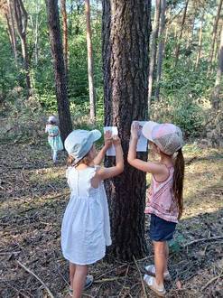 Auch werden Kreativität und Fantasie im Wald geweckt. Mit Stift und Zettel bewaffnet gehen wir zu den Bäumen und drucken die Rinde. Wie viele unterschiedliche Muster da zum Vorschein kommen oder wie viele bunte Bilder entstehen, indem wir uns hinsetzen und das Holztipi und die Bäume herum malen.