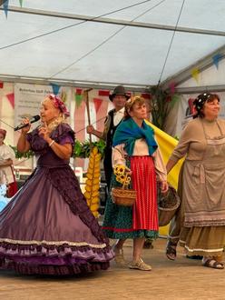 Dies zeigte sich am Freitag, den 29.8., als um 18 Uhr im Festzelt auf dem Sportplatz alle Sitzplätze belegt waren. Die Börlnerinnen und Börlner sowie weitere Gäste und Sponsoren konnten die Anspannung, Vorfreude und Energie schon ganz deutlich spüren. Unter einer kurzen lautstarken Vorankündigung war die Aufmerksamkeit ganz nach vorne gerichtet. Die öffentliche Festsitzung begann mit einem Film über Börln. Hier zeigte sich unser Dorfleben: in der Feuerwehr, beim Pferdesport, Volleyball oder in der Schwalbentenne. All das, womit wir uns verbunden fühlen und wofür unser Ort steht. Gleich darauf betraten Schauspieler in ihren Gewändern gemeinsam mit Märchenfee Lia die Bühne, welche den am 26.04.1200 in Kolmitz abgehaltenen Landthing vorführten. Da unsere Märchenfee für Mitmachmärchen bekannt ist, hatten auch unsere Gäste, Bürgermeister Herr Löwe sowie Bürgermeister Herr Weigelt, eine tragende Rolle bekommen. Nach reichlichem Applaus für die Mühe und Künste durften die Gäste ihre Ohren spitzen, da es ein eigens kreiertes Lied, das Börln-Lied, erstmalig zu hören gab. Dieses begleitete uns dann das gesamte Wochenende und einige Börlner zeigten frühzeitig Textsicherheit.
