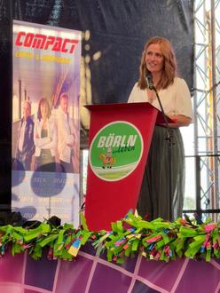 Nach dieser gelungenen Einstimmung war es nun an der Zeit, die Festrede zu halten. Daniela Wünscher führte in ihrer Rede die Entstehung und Prozesse zum 825jährigen Jubiläum aus, schenkte den Beteiligten des Festwochenendes Aufmerksamkeit und Dankbarkeit und ging außerdem auf das ein, was die Menschen an Börln schätzen. Denn hierzu gab es im Laufe des Jahres verschiedene Umfragen, auf welche die Menschen Antwort fanden. Mit „Börln, an dir schätze ich“ begann eine Aufzählung an Wertschätzung wie „Kindheitserinnerungen, Idylle und Freunde“, „bei einem Spaziergang im Park die Ruhe zu genießen“, „die Traditionen und Feste“ und „dass es eine völlig andere Welt ist, als ich bisher kannte“ u.v.m.