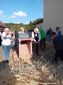 Auch andere alte Handwerkstechniken faszinierten die Gäste: Vom Spinnen und Federnschleißen über das Dreschen mit Flegel bis hin zur Vorführung eines historischen Handstiftendreschers der Firma Lanz aus dem Jahr 1900 – das Interesse war groß.