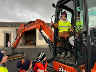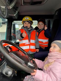 Die Kinder durften in einem riesigen Kipplaster, Bagger und Radlader die Kabinen bestaunen sowie alles genauer unter die Lupe nehmen. Herr Haferkorn hat extra für unseren Besuch Bausteine in Originalgröße aus Styropor hergestellt. Sogar die Farbe darauf war täuschend echt. Dabei wurden der Phantasie keine Grenzen gesetzt. Auch ein kleines Würfelspiel rund um eine Baustelle lud zum Spielen ein. Darüber hinaus hatte Frau Haferkorn für die kleinen HandwerkerInnen ein echtes Bauarbeiterfrühstück zubereitet.