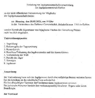 werden hiermit alle Eigentümer von bejagbaren Flächen der Gemarkung Dahlen recht herzlich eingeladen.
