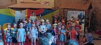 Nachdem unsere Großeltern von unserer Märchendarbietung in Dornreichenbach so geschwärmt hatten, wollten unsere Eltern auch gerne in den Genuss kommen und unsere kleinen Akteure bewundern. Dem Wunsch wollten wir natürlich nachkommen, also wurden alle Eltern von Ihren Kindern für den 9. Juni zum Mutter-Vater-Tag eingeladen. Die Kinder übten ein Musical von der „Vogelhochzeit“ ein und hatten großen Spaß dabei. Schnell gingen die Lieder wie ein Ohrwurm in den Kopf. Nach und nach gelang es uns, alle Kinder beim Musical mitwirken zu lassen. So bekam jedes Kind eine kleine Rolle und durfte sein Können zeigen. Alle Kinder waren schon Tage vorher aufgeregt: „Wann spielen wir die „Vogelhochzeit endlich auf?“ wurde täglich nachgefragt. Dann war es endlich soweit: alle Eltern waren für 15.00 Uhr in die Scheune eingeladen. Dort wartete schon selbst gebackener Kuchen von den Omas und auch die eine oder andere Mutti ließ es sich nicht nehmen, einen Kuchen zu backen. Viele Eltern hatten sich schon ein Plätzchen in der Scheune gesichert und stärkten sich bei Kaffee und Kuchen, als ihre Kinder - die Hauptdarsteller - kamen. Alle machten sich hinter der Bühne für ihren großen Auftritt startklar. Es wurden Kostüme angezogen und letzte Absprachen getroffen, dann ging es auch schon los. Viele kleine Vögel begrüßten die Eltern mit einem kleinen Lied bevor das Musical startete. Nach und nach füllte sich die Bühne mit Vogelmännchen und Vogelweibchen, es gab Vogelküken und dann auch schon Vogelkinder. Immer wieder belebte unsere bunte Vogelschaar die Bühne neu und in jeder Szene gab es für die Zuschauer etwas Neues zu entdecken.