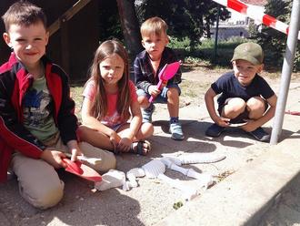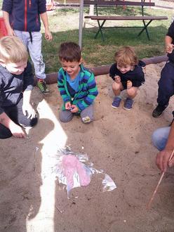 So verging auch die 2. Woche wie im Flug. In der 3. Woche starteten wir kreativ und begannen mit Gipsfiguren anmalen. So bekamen Stegosaurus, Brachiosaurus und der gefürchtete T-Rex von uns Farbe und sahen so einzigartig aus. Und dann wurden wir noch zum Paläontologen, denn im Garten entdeckten wir auf einmal eine Ausgrabungsstätte. Schnell machten wir uns mit Pinsel und Schippe ans Werk und gruben ganz vorsichtig Teile von Dinoskeletten aus. Am Ende konnten wir 3 T-Rex Skelette finden.