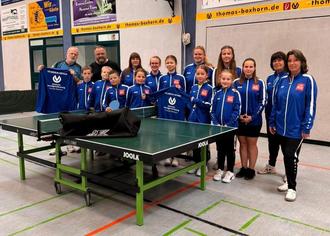 Spielerinnen und Spieler der Abteilung Tischtennis präsentieren ihr neues Trainingsoutfit. Sponsor Thomas Boxhorn überreichte die Trainingsanzüge während des Nachwuchstrainings der Abteilung Tischtennis des VfB. Es hatte schon eine Weile gedauert und die Übergabe verzögerte sich durch unvorhergesehende Ereignisse, doch waren am Trainingstag alle anwesenden TischtennisspielerInnen sehr stolz, endlich die neuen Anzüge in Empfang zu nehmen. Und weitere Anzüge werden noch folgen, versprach Thomas Boxhorn.