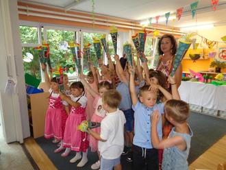 ... zu unsrem Kindergarten. Wir dürfen in die Schule gehn` und können kaum noch warten. Wo ist denn nur die Zeit geblieben? Dass fragen wir uns und wir denken, dass sich auch eure Eltern darüber wundern, wie schnell ihr groß geworden seid. Eben noch seid ihr aus der Krippe zu uns in den „großen“ Kindergarten gekommen, habt das Schneiden gelernt, wie man Reißverschlüsse schließt und wie man sich die Haare kämmt und nun wollt ihr wissen, wie der Name der besten Freundin geschrieben wird, was 200 plus 320 ergibt und wie man Tomatensoße kocht. Aber so einfach ließen wir euch nicht ziehen. Wir begingen unsere letzten Wochen mit unserer Abschlussfahrt in den Cottbusser Zoo. Bei strahlendem Sonnenschein machten wir uns mit Zug und Parkeisenbahn auf den Weg. Tiger, Elefant und Co. haben uns alle begeistert. 18 Uhr sind wir hundemüde aber glücklich wieder am Bahnhof DoKi aus dem Zug gepurzelt. Unser Zuckertütenfest wäre beinahe im Starkregen, Blitz und Donner untergegangen. Schnell alles rein verlegt und los ging die Party mit eurem Programm für Eltern, Großeltern und Geschwister, Kinderdisco, Buffet, Puppentheater und natürlich gab´s zum Abschied auch eine kleine Zuckertüte für euch.
