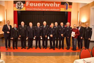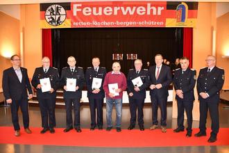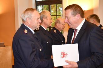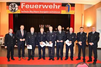 Landrat Christian Jaschinski, Kreisbrandmeister Steffen Ludewig, der stellv. Kreisbrandmeister Frank Romey und Bürgermeister Enrico Reiche überreichten die Ehrungen und dankten den Geehrten für ihr außergewöhnliches Wirken im Dienst der Gemeinschaft.