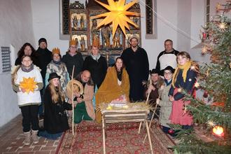 ... hieß es am Heiligen Abend in unserer Kirche. Nachdem wir die letzten 2 Jahre coronabedingt den Gottesdienst mit dem traditionellen Krippenspiel außerhalb der Kirche abgehalten haben, konnten wir in diesem Jahr wieder in das innere der festlich geschmückten Kirche vor den weihnachtlich anmutenden Altar mit Maria, dem Jesukind und dem heiligen Nikolaus zurückkehren. Nach einleitenden Worten der Lektorin Frau Konrad kam das Krippenspiel zur Aufführung. Die zahlreichen Besucher in dem gut gefüllten Raum konnten hierbei teilhaben an den Nöten des Josef, die von einem zerbrochenen Stock über eine überfüllte Herberge bis hin zur Gefahr des neugeborenen Kindes durch Herodes reichten und zum Schluss mit dem stimmungsvollen Lied "Stille Nacht, Heilige Nacht" endeten. Nach der Verlesung des Evangeliums und einem weiteren gemeinsamen Lied konnte die Gemeinde den Segen empfangen und in festlicher Stimmung den Heimweg antreten.