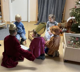 Auch unser religionspädagogischer Ansatz kam natürlich nicht zu kurz: Wir bekamen Besuch von den heiligen drei Königen, die am 6. Januar dem Jesuskind die Gaben in den Stall brachten. So brachten sie uns auch Geschenke für unsere Kindergartengruppen, über die sich unsere Kinder sehr freuten. Von Bauelementen, Verkleidungssachen und Büchern war allerhand dabei. Gemeinsam mit den Kindern spielten wir auch noch einmal die Geschichte um Caspar, Melchior und Balthasar nach.
