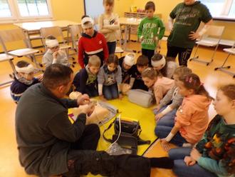 Donnerstag und Freitag bekamen wir Besuch vom Erste-Hilfe-Trainer Herrn Prisk. Spannend und praxisnah erläuterte er den Kindern die Grundlagen der Ersten Hilfe und jede(r) konnte sich mal in die Rolle des Unfallopfers und Retters versetzen, Verbände anlegen und üben, wie man einen Notruf absetzt. Ein Zertifikat am Ende war der verdiente Lohn. Auch hier ein Dankeschön für den spannenden Einblick!