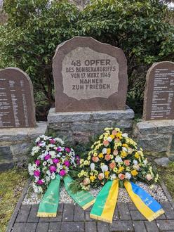 „48 Opfer des Bombenangriffs vom 17. März 1945 mahnen zum Frieden“ ist auf dem Gedenkstein zu lesen. Das Mahnmal wurde 1955 im Schillerpark enthüllt. 2021 wurde in Vorbereitung des Gedenkens das Mahnmal sowie das Areal im Schillerpark erneuert. Unseren Bürgern wurde damit ein Ort des würdevollen Gedenkens an die Opfer von 1945 übergeben.