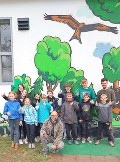 Bereits im vergangenen Jahr setzten Kinder und Jugendliche des Hortes „Kinderland“ und des Jugendhauses mit dem Künstler Ralf Hecht ein Graffiti-Projekt am alten Heizhaus an der Kita „Krümelkiste“ um. Waren im vergangenen Jahr Motive zum Thema “Bauernhof“ erwünscht, standen in diesem Jahr „Waldmotive“ auf der Wunschliste der Einrichtung.