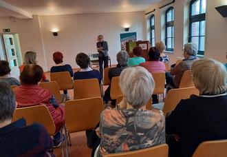 Sie las vor 20 interessierten Teilnehmern aus ihrem neuesten Roman: „Das Café, der Wald und der Tod“ und gab viele Hintergrundinformationen über ihr Schaffen. Für alle Leser, die nicht dabei sein konnten, ist das Buch in der Bibliothek ausleihbar.
