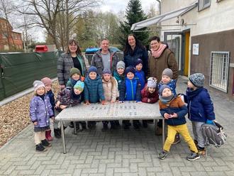 Gemeinsam mit ihm und seinen Mitarbeitern tüftelten wir schon lange über eine Neugestaltung unserer Gartentische. Wir als Kita-Team hatten die Idee, auf die Tischplatten verschiedene Spiele einzuarbeiten, damit auch im Außenbereich jederzeit z.B. „Mensch ärgere dich nicht“ gespielt werden kann. Die kreativen Kollegen von Rico Berl zauberten außerdem ein „Mandala-Spiel“, eine „Rennstrecke“ und ein „Vier gewinnt“ Spiel auf die neuen Stein-Tischplatten. In detailgetreuer Kleinstarbeit sind für die Kinder 4 wetterbeständige und langlebige Außenspiel- und Gartentische entstanden.