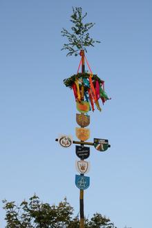 Geschmückt mit einen Birkenkranz, bunten Bändern und 2 neuen Schildern, haben ihn unsere Männer aufgestellt.