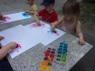 Nachdem wir am 04. Juni unser Kinderfest in der Kita feierten (mit Spiel, Spaß, Zuckerwatte, Kinderschminken, leckeren Waffeln, Luftballontieren und lustiger Musik) stellte sich nun endlich der Sommer ein. Wir spielen jetzt am liebsten auf unseren luftigen Spielplätzen und an den vielen Wasserstellen. So z.B. in der Matschküche, am Wasserbecken oder beim Gießen unseres Kindergärtchens und der vielen schönen Beete. Außerdem summt und brummt es auf unseren Wiesen und wir können Käfer und Bienchen bei ihrer Arbeit beobachten. Nicht nur unsere Wiesen leuchten in bunten Farben, auch auf dem Papier waren wir jetzt kreativ. Mit farbigen Eiswürfeln aus Lebensmittelfarbe konnten wir uns künstlerisch austoben. Es entstanden bunte Kunstwerke, bei denen wir beobachten konnten, wie aus Grundfarben neue Farben entstehen. Wir freuen uns auf weitere Wasserspiele an den heißen Sommertagen.