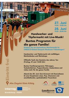 Anlässlich des 10-jährigen Jubiläums als UNESCO Global Geopark finden die Feierlichkeiten zum Gestein des Jahres 2025 dieses Jahr im Geopark Muskauer Faltenbogen / Łuk Mużakowa statt. Begleitend findet am 27. und 28.06. an der Alten Ziegelei in Klein Kölzig ein Töpfer- und Handwerkermarkt mit vielfältigen Aktionen und Angeboten unserer Partner statt. Das Markttreiben beginnt mit der offiziellen Taufe des Gesteins am Freitag, den 27.06. um 14:00 Uhr. Am Samstag, den 28.06. ist der Markt ab 10:00 Uhr geöffnet. Abgerundet wird das Programm am Abend durch das Geo'nConcert, ein deutsch-polnisches Live-Musik-Event mit anschließender Feuershow. Freuen Sie sich auf die mitreißenden Klänge des beliebten „Duo LeDazzo“ aus Cottbus, die für eine unvergessliche musikalische Atmosphäre aus Jazz, Pop und Chansons mit traditionellen Elementen sorgen.