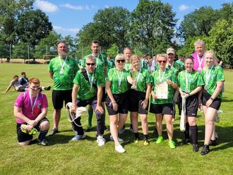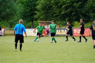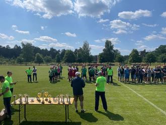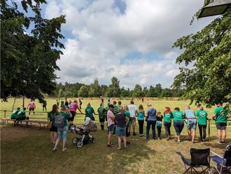 Nach anfänglichem Zögern, nahmen letztlich 9 Männer und 5 Frauen 1x wöchentlich am Training teil. Auch wenn einige Mitarbeiter/innen noch nie auf einem Fußballplatz standen, so traten alle motiviert am Turniertag in Haasow an. In den 5 Vorrundenspielen wurden sie von der grandiosen Fangemeinde lautstark mit Pauke, Tröte und Fanrufen unterstützt! Dank unseres Torschützen Moritz Rabe wurde zumindest das Spiel gegen die Auswahl des Landkreises Żary 3:1 gewonnen. Im 9-Meter-Schießen war die Gemeinde Neuhausen/Spree letztlich etwas besser und somit belegte das Team Rasensprenger den 8. von 10 Plätzen. Wobei dieser groß gefeiert wurde, weil sie mehr oder weniger die einzige Hobbymannschaft unter Profis war.