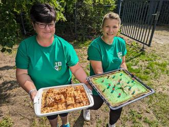 Die Pausen wurden durch Kuchen von Frau Redlow und Frau Tschammer sowie der Versorgung des Landkreises zum Stärken genutzt. Frau Wunderlich „dekorierte“ dabei die Fans mit dem Wappen des Amtes Döbern-Land. Der Landkreis Spree-Neiße/Wokrejs Sprjewja-Nysa und die Gemeinde Neuhausen/Spree hatten alles gut organisiert – leckere Verpflegung, Bespaßung für die Kids durch das Knax-Mobil der Sparkasse Spree-Neiße, Mülltonnenrennen und Waschmaschinen-Schießen des Eigenbetriebes Abfallwirtschaft und Live-Musik von Brian Bossert.
