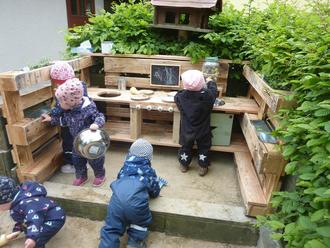Ebenfalls baute uns Familie Richter eine neue Matschküche. Beides wurde fast zeitgleich aufgebaut und die Kinder waren sofort begeistert. Nun wird gekocht, gebacken und momentan viel Eis hergestellt.