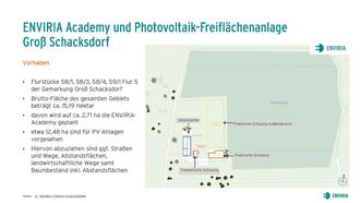 Diese Photovoltaikfreiflächenanlage bildet die Voraussetzung der ENVIRIA Academy. Sie dient der Finanzierung des Umbaus der bestehenden Gebäude / baulichen Anlagen in eine Akademie mit Unterkünften, Lagerräumen und Schulungsräumen zur theoretischen und praktischen Aus- und Weiterbildung von Elektrikern und Monteuren im Fachbereich Photovoltaik. Das Akademieareal umfasst die Flurstücke 58/1 und 59/1 der Flur 5 in der Gemarkung Groß Schacksdorf mit einer Gesamtfläche von ca. 27.100 m².