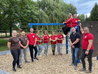 Und dann waren die Erzieher/-innen an der Reihe. Der „Dorf- und Jugendclub“ aus Wolfshain spendete uns neue T-Shirts. Wir bedanken uns für die großzügige Spende und freuen uns, dass wir sie zum Ostblocktreffen am 02.09.2023 das erste Mal tragen werden.