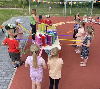 Dann war es so weit: Alle Kinder stellten sich um den Tisch, auf dem die Portfolios mit bunten Bändern zusammengebunden lagen. Diese wurden nacheinander durchtrennt - als symbolischer Abschied von der Kitazeit.