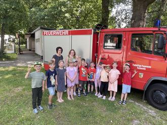 Doch damit nicht genug: Es gab noch eine Überraschung! Plötzlich ertönte ein lautes TATÜTAAATAAA - die Feuerwehr fuhr vor. Mit dabei war Frau Schötz von der Sparkasse, die eine große Kiste mitbrachte.