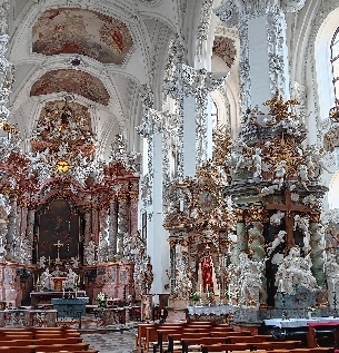Museen, ein Himmelstheater, ein Weinberg sowie ein großer barocker, nach französischem Vorbild angelegter und in der heutigen Form um 1700 entstandener Garten mit Labyrinth und Spiegelteich, so angelegt, dass sich beide Kirchen darin spiegeln können bewundert werden. Leider blieb uns zu wenig Zeit, dennoch genug, um den Laden in der Brauerei zu besuchen und dieses oder jenes „Mitbringsel“ zu erwerben.