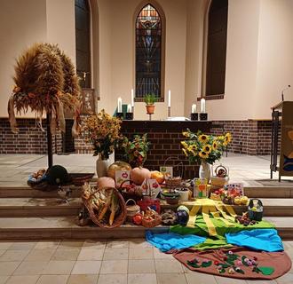 Im Anschluss daran sangen wir „Seht, was wir geerntet haben“ und legten freudig und stolz unsere mitgebrachten Erntegaben vor dem Altar nieder.