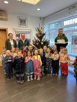 Wir bestaunten den großen Weihnachtsbaum und machten uns direkt ans Werk. Die Kinder hatten viel Freude daran und nach kurzer Zeit war er auch schon festlich geschmückt. Im Anschluss sagten wir ein kleines Gedicht auf und sangen das Lied vom Nikolaus. Der Erfolg unserer Mission wurde mit einem kleinen Geschenk und einem Glas Saft belohnt. So gestärkt traten wir den Rückweg zur Kita an.