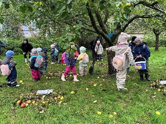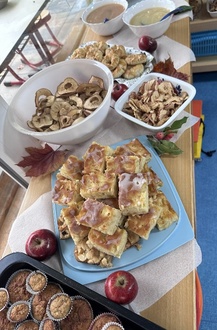 Ein paar Tage später fand unser Apfelfest mit den Eltern statt. Dort sorgten unsere kleinen Künstler mit Herbstliedern und einem liebevollen Anspiel für eine stimmungsvolle Atmosphäre. Ein buntes Apfelbüfett zeigte, wie vielfältig der Apfel ist: Von selbstgebackenen Apfelkuchen der Kinder über Apfelmus, Desserts und Gebäck bis hin zu frischem Apfelsaft – alles liebevoll zubereitet von fleißigen Eltern.