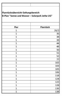 Für die Errichtung der Photovoltaikanlage soll ein Bebauungsplan (B-Plan) mit Sondergebiet Photovoltaik „Sonne und Wasser – Solarpark Jethe“ festgesetzt werden.
