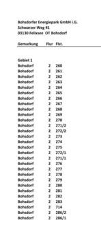 Der Geltungsbereich und die dazugehörige Übersicht der Flurstücke für den Bebauungsplan „Photovoltaik-Freiflächenanlage Bohsdorf I“ sind den Anlagen dieser Veröffentlichung zu entnehmen.