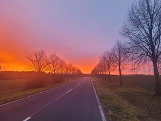 Sonnenaufgang auf der Verbindungsstraße zwischen den Ortsteilen Gosda und Dubrau in der Gemeinde Wiesengrund (Foto: R + R)