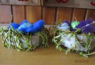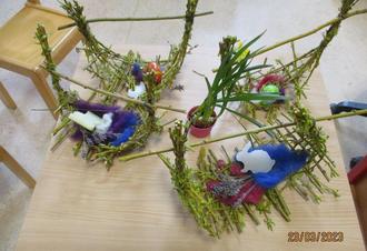 Wie schon 2019, besuchte uns auch in diesem Jahr Frau Frühauf aus Klein Kölzig. Sie brachte lange Weidenzweige mit, aus denen wir zusammen mit den Kindern unter Ihrer Anleitung großartige Osterkörbe und Osternester bastelten. Ausgeschmückt wurden diese mit weiteren Naturmaterialien, wie Schafwolle und Lavendel.