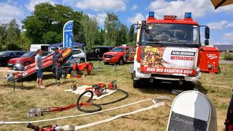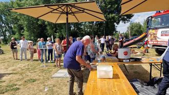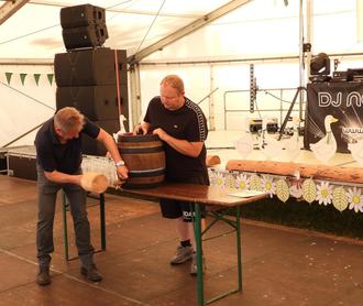 Der Bürgermeister Bernd Schlobach eröffnete mit einem gekonnten Fassbieranstich am Samstag die Festlichkeiten. Zeitgleich strömten die ersten Besucher auf den traditionellen Naturmarkt, wo viele Vereine und Händler ihre Stände aufgebaut hatten. Es war ein wahres Schlaraffenland für alle, die gerne selbst Hand anlegen oder einfach nur zuschauen wollten. Von Mit-Mach-Stationen beim Arbeiter-Samariter-Bund, dem NABU Torgau, dem Landschaftspflegeverband Torgau-Oschatz oder dem Naturpark Dübener Heide – hier war für jeden etwas dabei! Jede Menge zu sehen gab es in diesem Jahr wieder unter dem Zelt des Dommitzscher Geschichtsvereins, der Funkamateure aus Torgau, der Polizeifachschule Dommitzsch und dem Auto-Center Torgau. Die Freiwillige Feuerwehr Dommitzsch präsentierte sich mit ihrer modernsten Technik und warb damit um neue Kameradinnen und Kameraden. Kulinarisch unterstützte der Förderverein der Feuerwehr Dommitzsch 2007 e. V. das Gänsebrunnenfest an beiden Festtagen mit ihrer deftigen Erbsensuppe und den Nudeln mit Gulasch aus der Gulaschkanone. Die Mitglieder des Kleingartenvereins „Einigkeit“ bewahrten trotz der hochsommerlichen Temperaturen einen kühlen Kopf und verkauften leckeren Kaffee und Kuchen am Samstag und Sonntag. Nicht zu vergessen die frisch geräucherten Forellen des Dommitzscher Angelvereins und die Brezeln des ortansässigen Betriebes Vandemoortele, die immer zur Bereicherung des Naturmarktes beitragen. Auch für alle Liebhaber von Selbstgemachtem, wie Strickwaren, genähten Kindersachen, Getöpfertem, Honig und weiteren Produkten der Imkereien, Kräutersalzen etc., gelaserten und gedrechselten Holzgegenständen gab es ein großes Angebot.