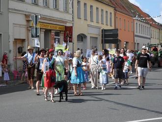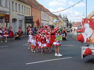 Nach einer kurzen Nacht hieß es dann am Sonntagmorgen: Aufstehen, Schlafmangel ist kein Grund, sich im Bett zu verstecken! Der traditionelle Weckumzug, der im Laufe der Jahre in Festumzug umbenannt wurde, zog mit 23 Schaubildern, jede Menge liebevoll geschmückten Mottowagen und über 300 Teilnehmern Fußvolk durch die Stadt. Man kann sagen, die halbe Nachbarschaft war auf den Beinen. Auf dem Festplatz angekommen wurden alle Schaubilder von Britta Wojtanowski willkommen geheißen und vorgestellt. Die Karnevalisten aus Elsnig und Wörblitz brachten anschließend das Festzelt mit ihren flotten Tänzen und unzähligen Zugaben noch einmal richtig zum Kochen! Sie hatten mehr als genug Schwung und gute Laune im Gepäck, um die Temperatur in schwindelerregende Höhen zu treiben!