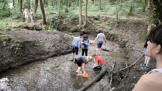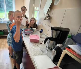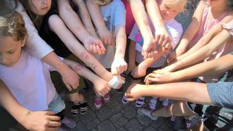 Wir bastelten uns unseren eigenen Bumerang, einen traditionellen Wurfstock der Aborigines, und unternahmen damit zahlreiche Wurfversuche. Einige Male kam er sogar zurück. Übung macht eben den Meister. „Ab ins Outback“ hieß es am Dienstag, wir streiften durch unseren Wald und bauten dort „Buden“ aus Ästen, Zweigen und Laub. Wer nicht durch den Wald streifen wollte, konnte australische Schildkröten aus Blumentöpfen gestalten oder mit an einer großen Sandskulptur, im Sandkasten, bauen. Ins „Outback“ ging es auch am Mittwoch. Wir wanderten zum Predel und gingen dort, im Bach, auf „Goldsuche“, wir wurden sogar fündig. Da ein Unwetter im Anmarsch war, mussten wir die Schatzsuche leider verkürzen. Am Donnerstag kamen alle Naschkatzen auf ihre Kosten. Wir haben australische Lamingtons gebacken und ließen uns diese zum Vesper schmecken. Die Woche klang mit einem Hortkino-Tag, am Freitag, aus. Gemeinsam sahen wir uns den australischen Animationsfilm „Zurück ins Outback“ an.