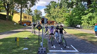 Wir sind durch den Parcours gelaufen und haben erklärt bekommen, wie die Schilder heißen und was sie für uns als Fahrradfahrer bedeuten. Auf der Strecke gab es neben den vielen Verkehrsschildern auch echte Ampeln, Kurven, Baustellen und einen Kreisverkehr. Wir haben Fahrräder bekommen und durften damit frei auf den Straßen fahren.