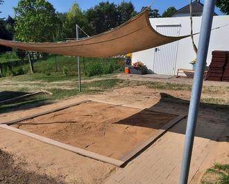 Wir haben neuen Sand bekommen und eine tolle Umrandung für unseren neuen „großen“ Sandkasten im unteren Außenbereich.