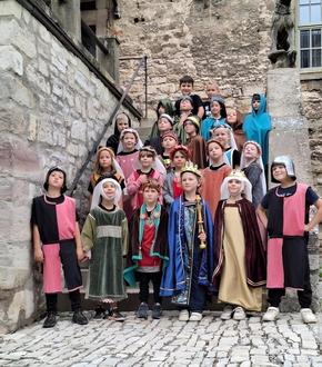 Am 19.06.2024 fuhren unsere Schmetterlinge mit dem Bus zu ihrer Abschlussfahrt auf Schloss „Neuenburg“ und tauchten dort in die Welt des Mittelalters ein. Mit tollen Kostümen und Gewändern verkleidet erhielten die Kinder einen Einblick in das damalige Leben auf einer Burg und spielten dieses in der Kemenate mit Ritterspielen nach. Dann brachten uns zwei Muttis ein leckeres Lunchpaket zum Mittagessen. Auf dem Außengelände der Burg fanden dann noch einmal ein paar lustige Ritterspiele statt und am späten Nachmittag holte der Bus die Kinder in die Wirklichkeit zurück und brachte sie wieder in die Kita.