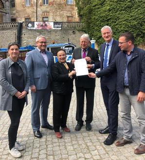 Ein Fördermittelbescheid über 16.340.000,00 EUR wurde für die Sanierung des Kernschlosses Droyßig übergeben. Ein großes Plakat weist jetzt auf die Sanierung des Schlosses hin.