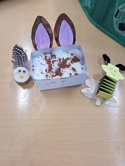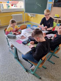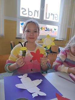 So boten die Horterzieher eine Station an, an der kleine Bienchen aus Papier gefaltet werden konnten. Weitere Angebote waren Schmetterlinge aus Wolle, kleine Geschenkboxen, Kresse-Häschen, Osterglocken aus Papier, Prickeln und Osteranhänger aus Astscheiben.