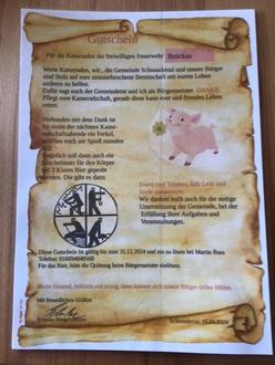 Hans-Hubert Schulze als Bürgermeister bedankte sich in einer kurzen Ansprache im Namen des Gemeinderates bei den 3 Ortswehren für die geleistete Arbeit im Jahr 2023. Er ging dabei auch auf die gute Zusammenarbeit und Ausbildung ein. Als Dank überreichte er den Ortswehrleitern je einen Gutschein in Form von „Essen und Trinken“ für einen geselligen Abend.