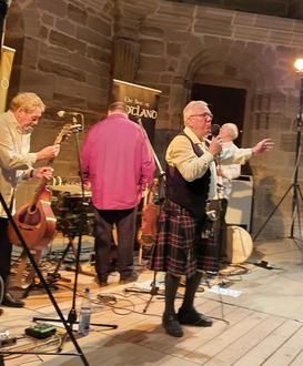 Endlich war es soweit. Unser Vereinsmitglied Helmut Gottwald begrüßte im feinsten schottischen Outfit die Band und das Publikum. Nebenher war er ein beliebtes Fotomotiv.